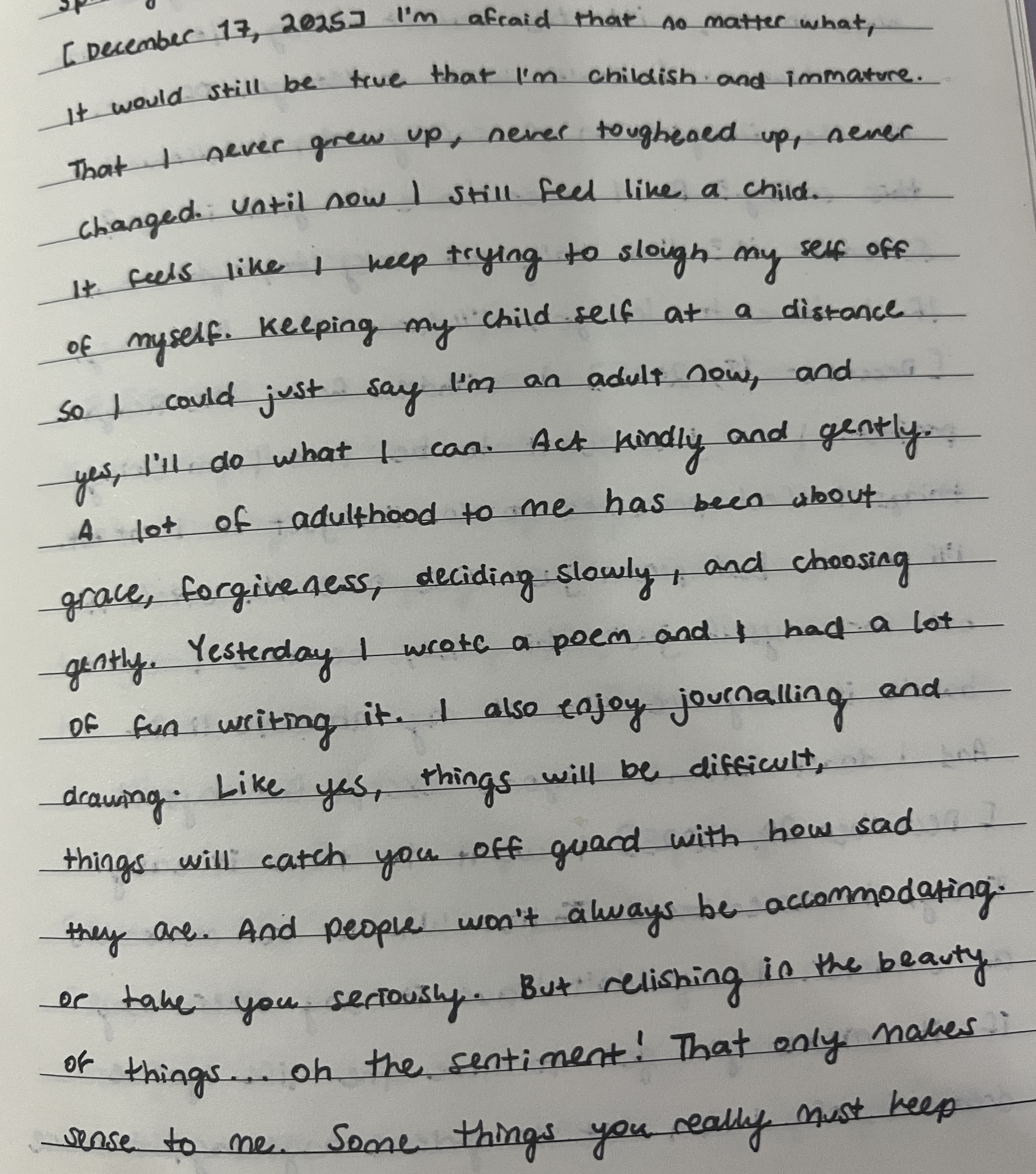 Everything is genuinely happening and has happened all at once. I think no amount of self reflection can turn back time. I know my memories are deceiving but I still miss the past. Things will never be the same again and I still can't breathe. I feel so lonely. I feel so lonely. And that I'm running out of time.